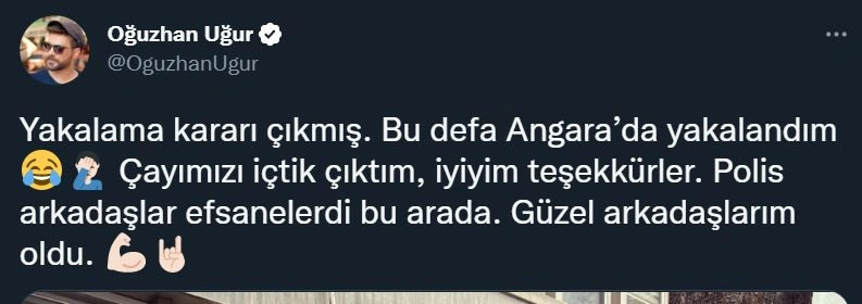 "Yakalama kararı çıkmış. Bu defa Angara’da yakalandım" ifadelerini kullanan Oğuzhan Uğur daha sonra serbest bırakıldığını ifade etti.