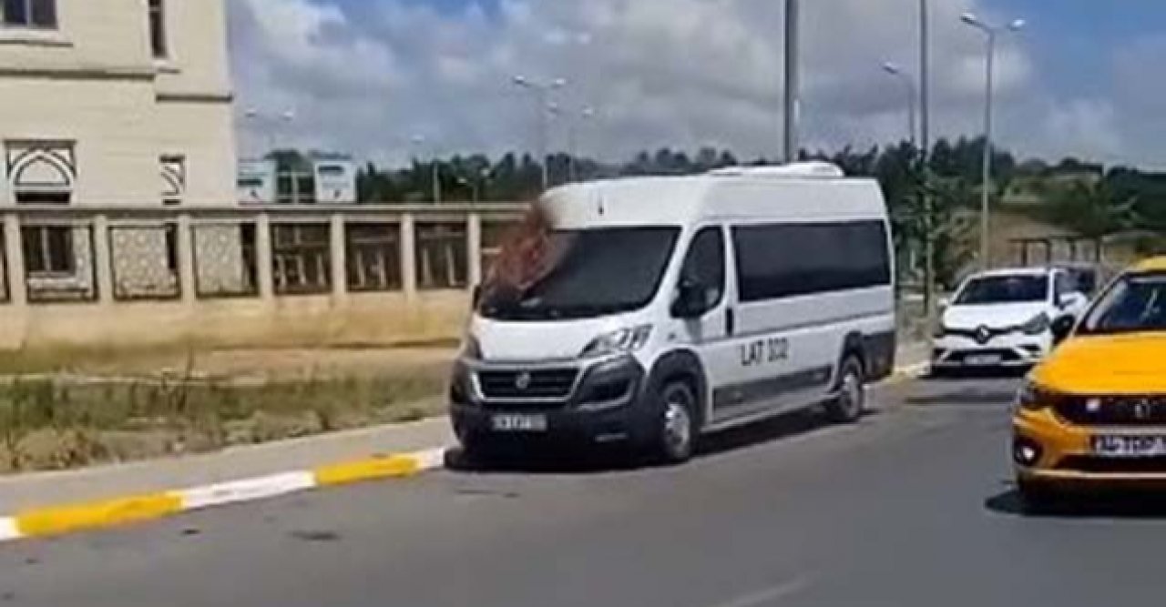 Bağcılar'da caddede park halinde bulunan servis minibüsü alev alev yandı. Yangının çıkış anı cep telefonu kamerasına yansıdı.