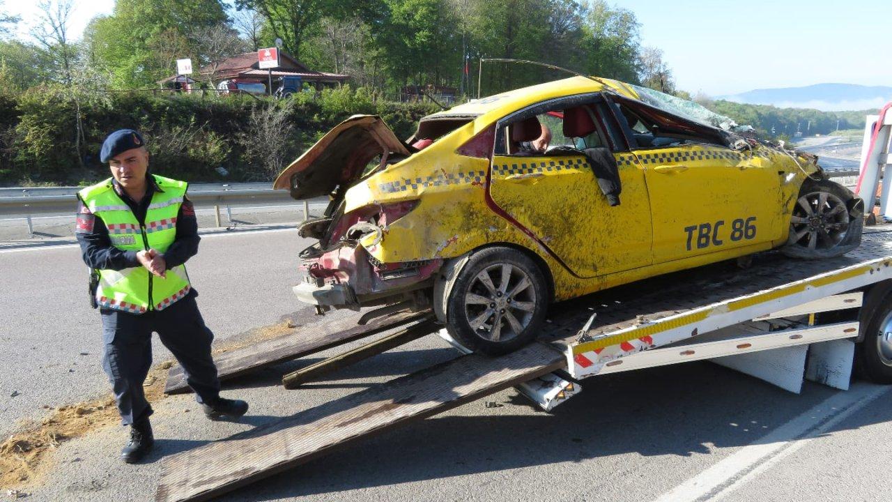 Bariyerlere çarptıktan sonra taklalar atan taksi hurdaya dönerken, yaralı sürücü ambulansla hastaneye kaldırıldı.