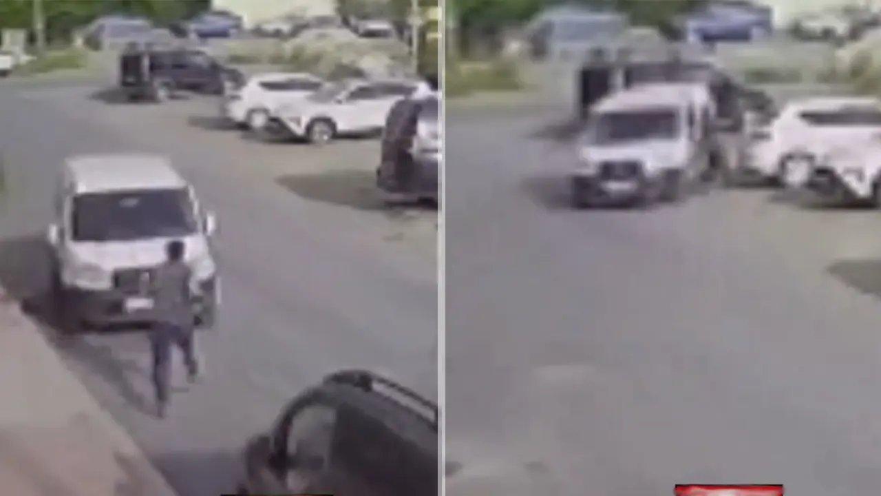 Eğimli olan yolda araç hızla geriye doğru kaymaya başlayınca adeta felaket yaşandı. Park ettiği aracının kaydığını fark eden sürücü hızla koşmaya başladı ve kazayı önlemeye çalışsa da iki aracın arasında sıkışmaktan son anda kurtuldu.
