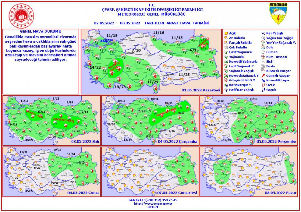 Meteoroloji’den yapılan duyuruda, “(2 – 8 Mayıs 2022) Genellikle mevsim normalleri civarında hava sıcaklıklarının Salı günü batı kesimlerden başlayarak hafta boyunca kuzey, iç ve doğu kesimlerde azalacağı ve mevsim normalleri altında seyredeceği tahmin ediliyor” ifadelerini yer verildi.