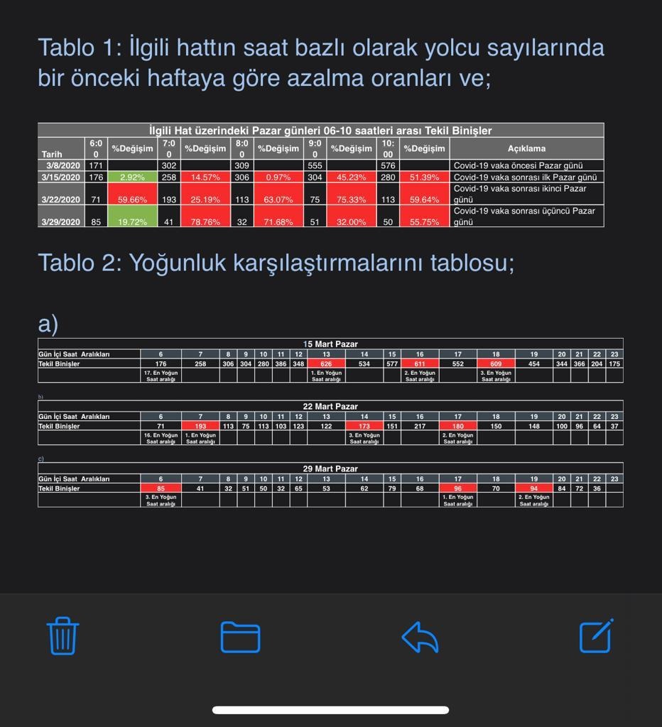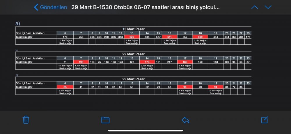 1- 29 Mart Pazar sabahı B-1530 kapı numaralı otobüsün, tüm sabah saatleri seferlerinde bir önceki haftaya göre yüzde 56 yolcu azalması yaşanmışken, o sabah saat 06-07 arası tam aksine yüzde 19,72 yolcu artışı gözlemlendi.