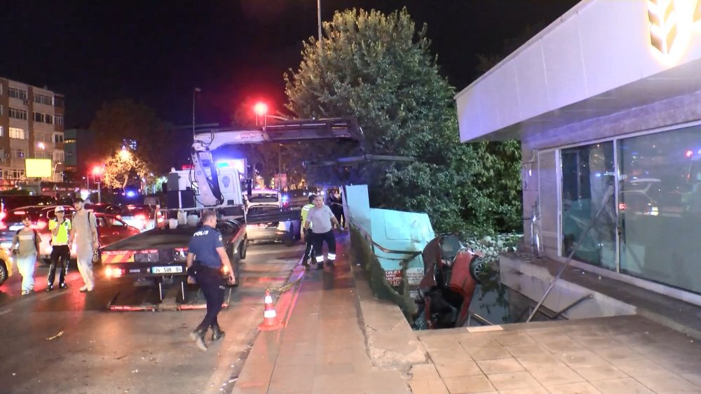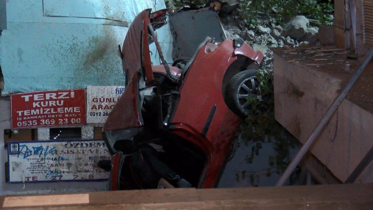 Sürücüsünün direksiyon hakimiyetini kaybettiği araç kaldırıma çarptı. Çarpmanın etkisiyle savrulan otomobil yol kenarında bulunan bir bankanın merdiven boşluğuna düştü.
