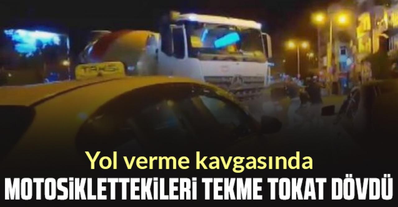 BEŞİKTAŞ'ta, beton mikseri şoförü ile motosikletteki iki kişi, yol verme nedeniyle kavga etti. Kavgada, beton mikseri şoförü motosikletteki iki kişiyi tekme tokat dövdü. O anlar kameraya yansıdı.