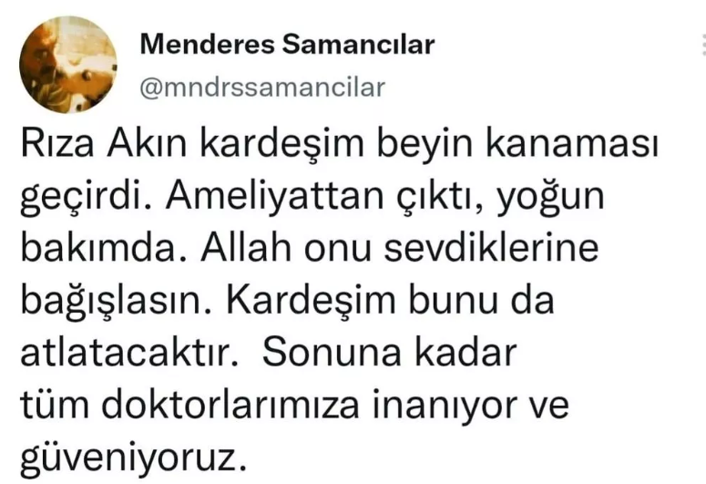 "Rıza Akın kardeşim beyin kanaması geçirdi. Ameliyattan çıktı, yoğun bakımda. Allah onu sevdiklerine bağışlasın. Kardeşim bunu da atlatacaktır. Sonuna kadar tüm doktorlarımıza inanıyor ve güveniyoruz."