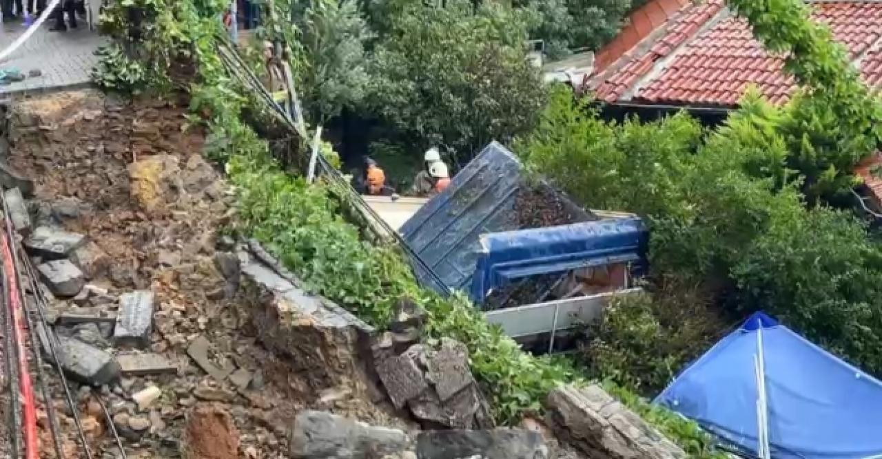 Beykoz'da yağışların ardından istinat duvarı dayanamadı.