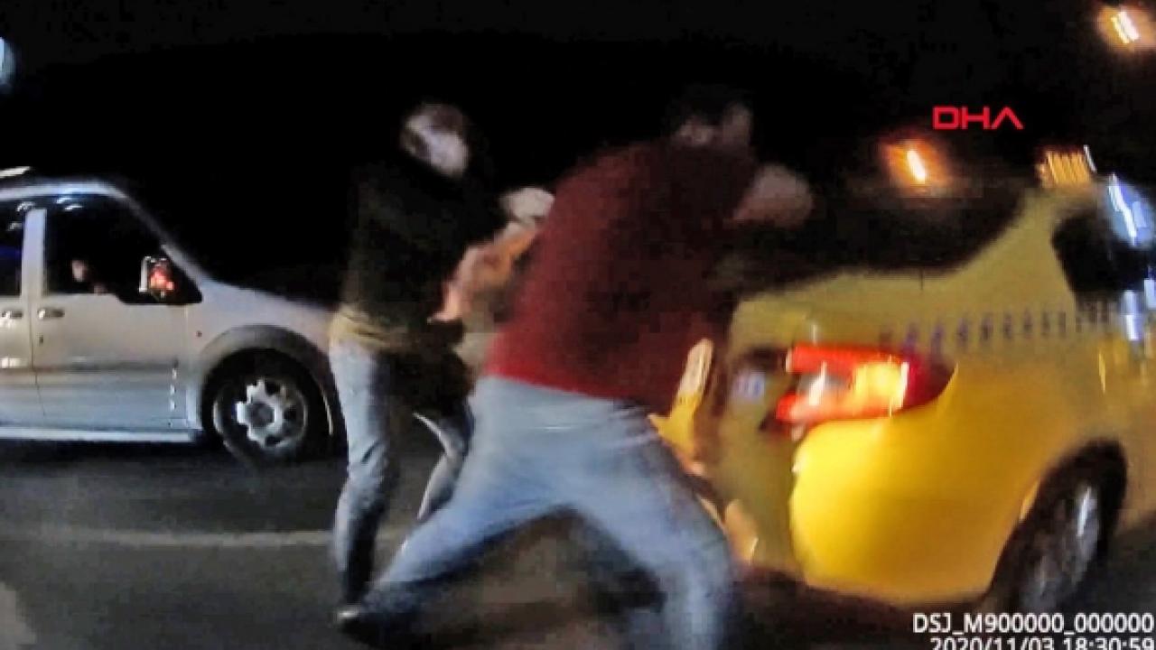 Beyoğlu'nda yolunu kestiği araçların aynalarını kıran ve sürücüleri tehdit eden kişi yine aynasını kırdığı taksiciden dayak yedi. O anlar kameraya yansıdı.