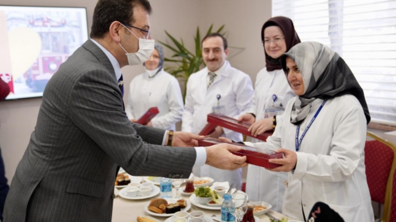 İstanbul Büyükşehir Belediye (İBB) Başkanı Ekrem İmamoğlu, “14 Mart Tıp Bayramı” kapsamında, İBB bünyesindeki Şehzadebaşı Tıp Merkezi’nde görev yapan mesai arkadaşı doktorlarla kahvaltıda bir araya geldi. İBB Genel Sekreter Yardımcısı Şengül Altan Arslan ve Sağlık Dairesi Başkanı Önder Yüksel Eryiğit’in eşlik ettiği İmamoğlu, “İyi öğrenci olma çabasında olan her çocuğun verdiği cevaplardan biri doktor olmaktır” dedi. Doktor olmanın meşakkatli bir yolculuk olduğuna dikkat çeken İmamoğlu, “Gerçekten yetenekli çocukların tercih ettiği, gençlerin o yolda kararlılık gösterdiği bir mesleki yolculuktur. Örneğin; şahsen ben, öyle bir cesaret gösteremedim o yaşlarımda. Ama o cesareti gösteren çok yakın sınıf arkadaşlarım oldu. 59 kişilik bir lise sınıfıydık. Yanılmıyorsam 13-14 doktorumuz var sınıfta. Her zaman da gurur duyarız onlarla, sizlerle de gurur duyduğumuz gibi” şeklinde konuştu.