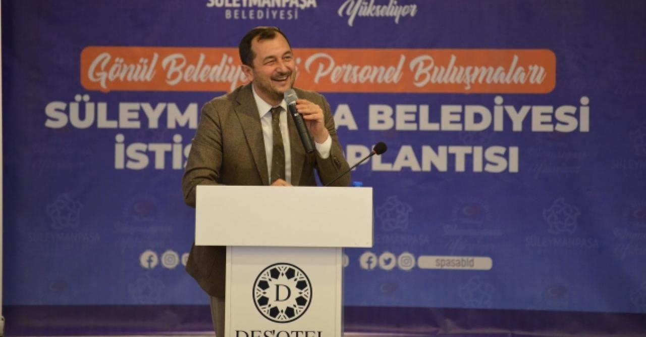 Başkan Yüksel’in sunumundan önce sırasıyla Temizlik İşleri Müdürü Bülent Demiröz ve Süleymanpaşa Belediye Başkanı Sabri Çınar da birer konuşma gerçekleştirdi. Müdür Demiröz personele verdiği değer için Başkan Yüksel’e şükranlarını dile getirirken Başkan Yardımcısı Çınar da personele teşekkür etti. Toplantının ardından açıklamada bulunan Süleymanpaşa Belediye Başkanı Cüneyt Yüksel, “Yükselen bir Süleymanpaşa için, birlikte canla başla çalıştığımız belediye personellerimizle buluştuk. Temizlik İşleri Müdürlüğümüz bünyesinde görev yapan mesai arkadaşlarımız ve eşleriyle bir araya gelerek, Gönül Belediyeciliğinin toplumumuzun tüm kesimlerine ve her bir ferdine dokunan hizmet anlayışını Süleymanpaşa’mızda yaşatan ve şehrimize değer katan kıymetli personellerimize, gayretli çalışmalarından dolayı teşekkürlerimizi ilettik. Toplantımızın hayırlara vesile olmasını diliyorum,” diye konuştu. Öte yandan, Personel Buluşmaları İstişare Toplantıları’nın diğer müdürlüklerle devam edeceği ifade edildi
