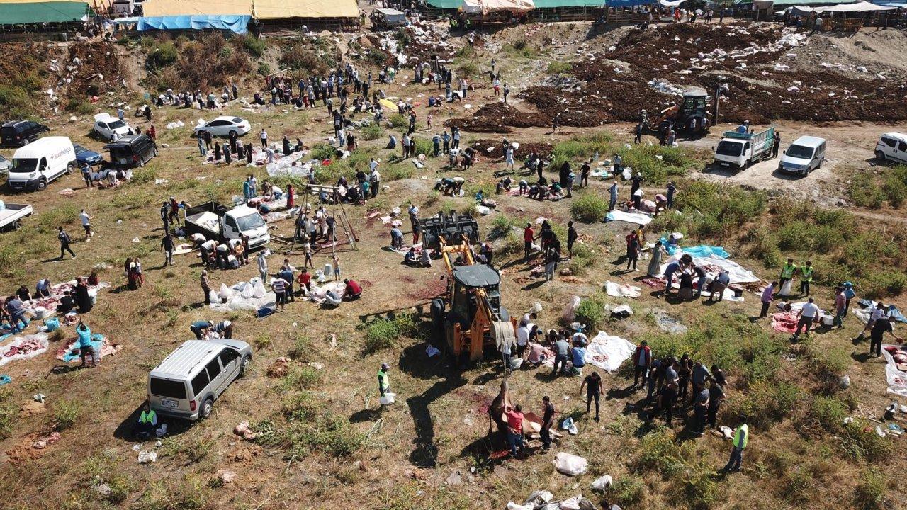 Esenyurt'taki kurban kesim merkezinin hemen yanında boş arsada da onlarca kişi kesim yaptı. Kesilen kurbanlıklar kepçelere asılarak deri yüzme işlemlerini yaptı.
