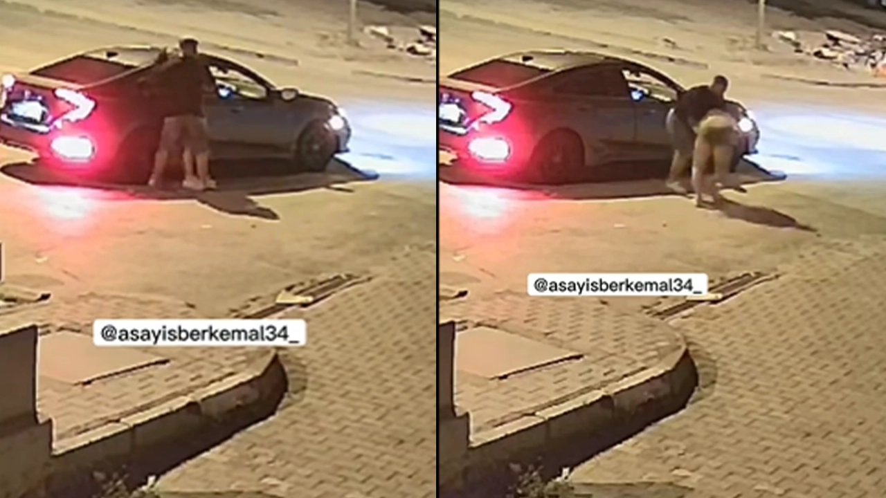 Adam ise kendisine vurmaya çalışan kadını engelleyerek yere düşürdü. Yerde tekmeler atmayı sürdüren kadın, aracı hedef alınca adam kadını bacaklarından tutup yerde sürükledi.
