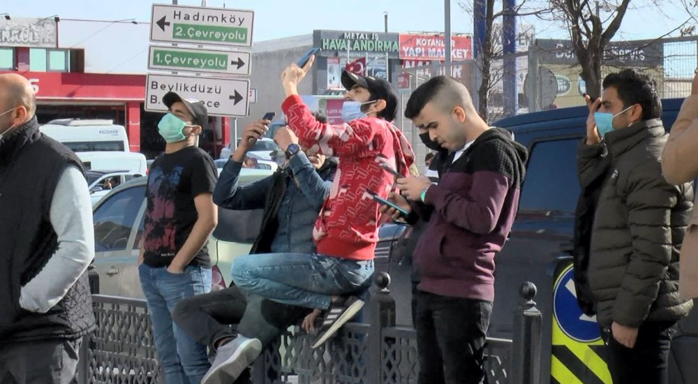 Öte yandan iş yerinde çıkan yangını izleyen ve görüntülemeye çalışan büyük bir kalabalık grup koronavirüs salgınını unutarak sosyal mesafe kuralını hiçe saydı. Bazı meraklı kişilerin maske bile takmadığı görüldü.