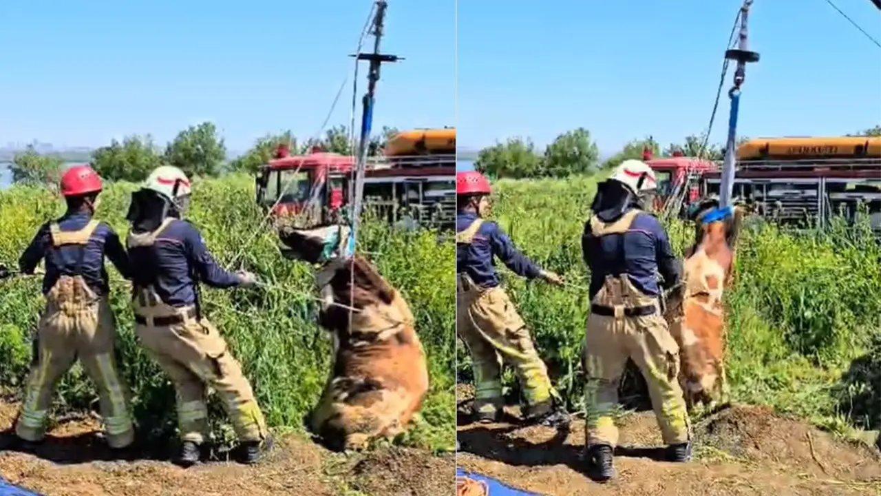 İtfaiye ekipleri halat ve vinçle ineği çekerek, uzun uğraşlar sonucunda kurtarmayı başardı. Canlı olarak ele geçirilen inek, tonlarca ağırlıkta olması nedeniyle itfaiye erleri tarafından güçlükle çekildi.