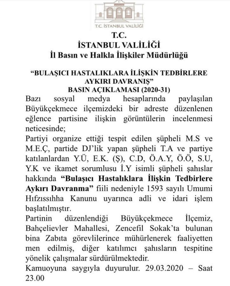 "Partiyi organize ettiği tespit edilen şüpheli M.S ve M.E.Ç, partide DJ'lik yapan şüpheli T.A ve partiye katılanlardan Y.Ü, E.K. (Ş), C.D, Ö.A.Y, Ö.Ö, S.U, Y.K ve ikamet sorumlusu İ.Y isimli şüpheli şahıslar hakkında 'Bulaşıcı Hastalıklara İlişkin Tedbirlere Aykırı Davranma' fiili nedeniyle 1593 sayılı Umumi Hıfzıssıhha Kanunu uyarınca adli ve idari işlem başlatılmıştır. Partinin düzenlendiği Büyükçekmece İlçemiz, Bahçelievler Mahallesi, Zencefil Sokak'ta bulunan bina zabıta görevlilerince mühürlenerek faaliyetten men edilmiş, diğer katılımcı şahısların tespitine yönelik çalışmalar sürdürülmektedir"