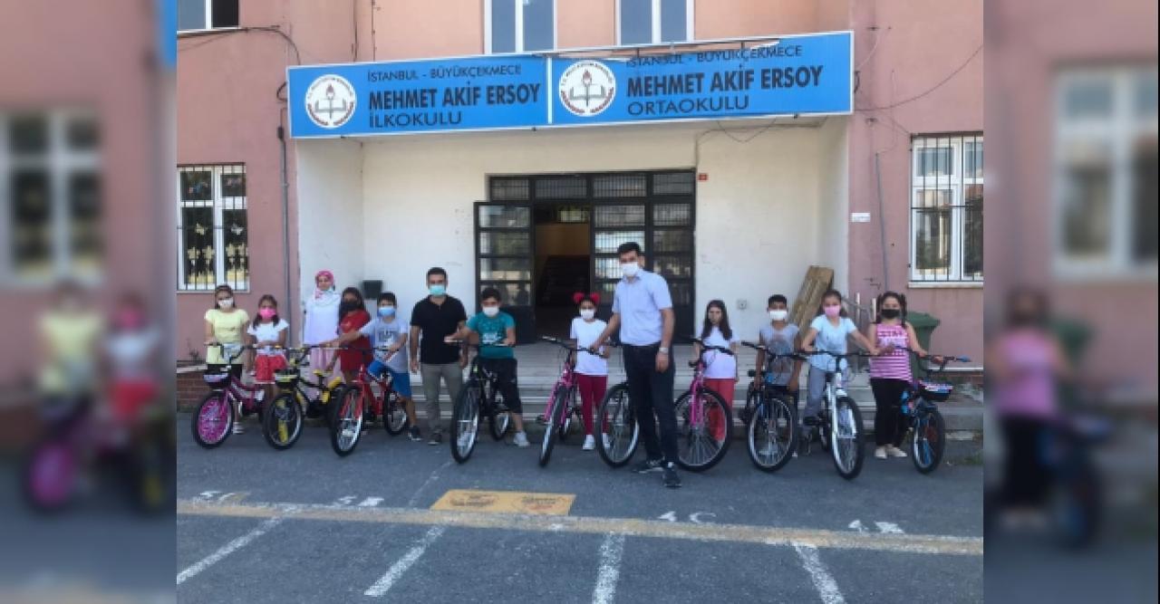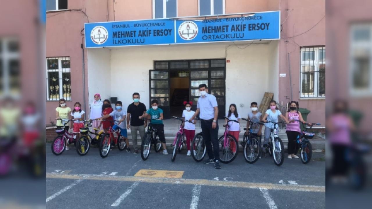 Okulda öğrencilere bisiklet eğitimi verebilmek ve bisikleti sevdirebilmek adına okul başkanının talep ettiği bisikletleri gören öğrenciler sevinç içinde bisikletlere bindi.