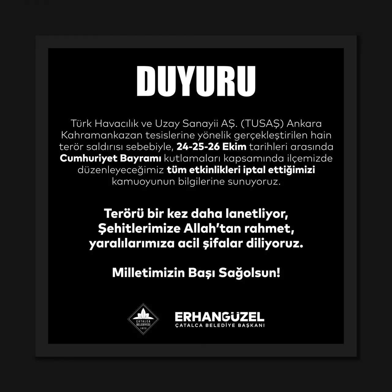 “Türk Havacılık ve Uzay Sanayii AŞ. (TUSAŞ) Ankara Kahramankazan tesislerine yönelik gerçekleştirilen hain terör saldırısı sebebiyle, 24-25-26 Ekim tarihleri arasında Cumhuriyet Bayramı kutlamaları kapsamında ilçemizde düzenleyeceğimiz tüm etkinlikleri iptal ettiğimizi kamuoyunun bilgilerine sunuyoruz.