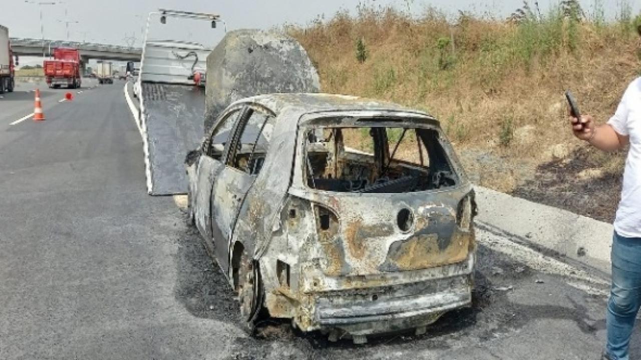 İstanbul Çatalca Nakkaş mevki'inden Silivri Cezaevi'ndeki yakınlarını ziyarete giden içerisinde 3 kişinin bulunduğu araç bir anda alev aldı. Sürücü alev alan aracı sağa çekerken, içindekiler ölümden döndü.
