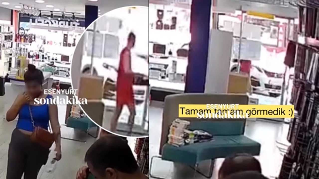 Esenyurt'ta bulunan cep telefonu dükkanına müşteri kılığında giren bir kadın iş yeri çalışanına yönelerek almak istediği ürün hakkında sorular yöneltti.
