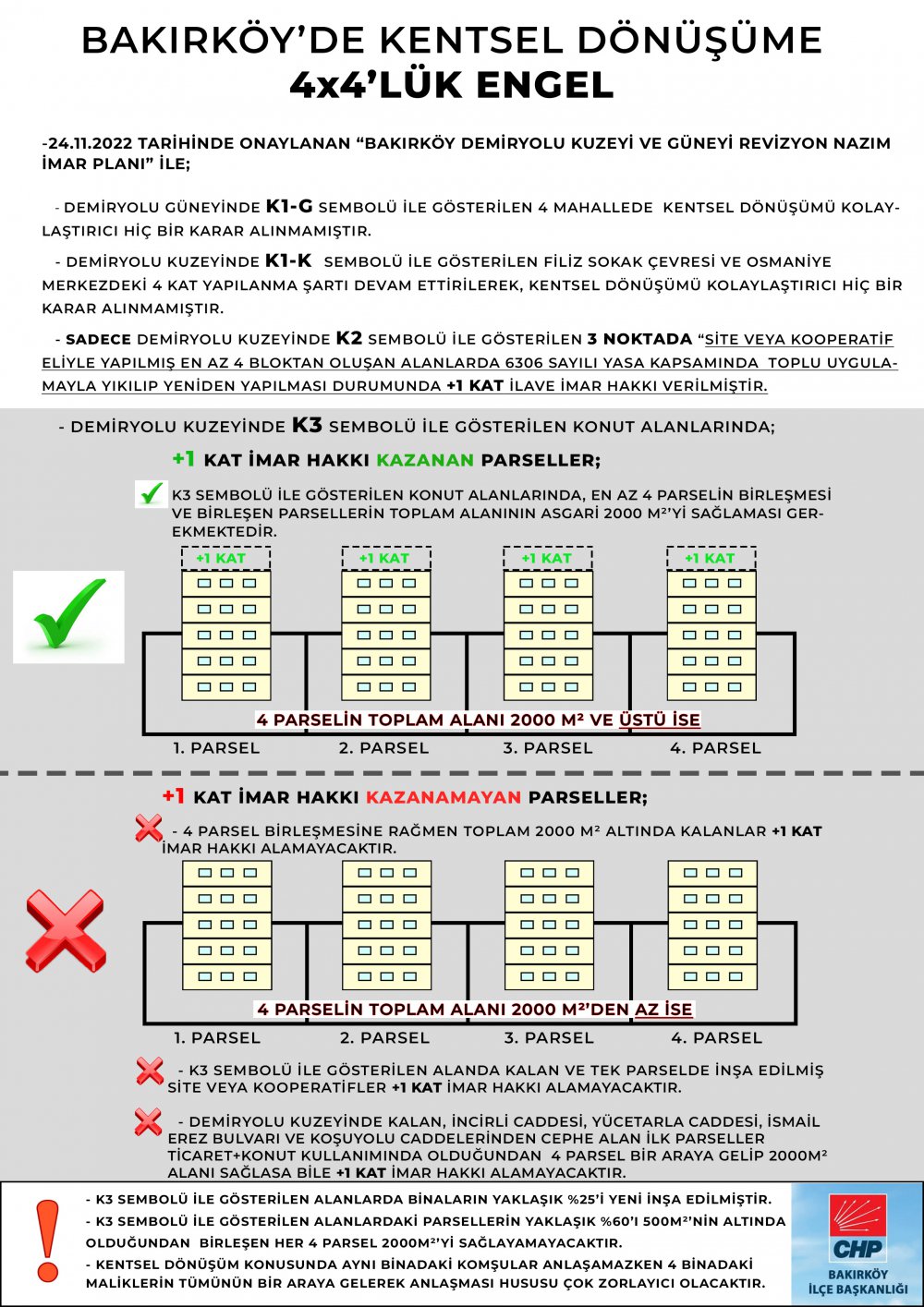 CHP Bakırköy İlçe Başkanlığı, başkanlık binasında düzenlediği toplantıda İBB’de tüm grupların oy birliği, CHP’li bazı meclis üyelerinin itirazlarıyla geçen 5 binlik planlarla ilgili açıklama yaptı. Toplantıya İBB’de grup kararına uymayarak ‘ret’ oyu veren Bakırköylü bazı meclis üyeleri de katıldı. CHP Bakırköy İlçe Başkanı Celal Sevinç’in organize ettiği toplantıda, Zuhuratbaba, Kartaltepe, Osmaniye, Zeytinlik, Cevizlik, Yenimahalle ve Sakızağacı Mahallesi’ni kapsayan 592 Hektar, 108 bin 653 kişiyi kapsayan planlar konuşuldu. İlçe Başkanı Celal Sevinç, yapılan dönüşümün Bakırköy’ün dönüşümüne dört dörtlük engel olduğunu söyleyerek, “Bakırköy'ün yaklaşan deprem riskini gözeterek büyük umutla beklediği kentsel dönüşüm için artı 1 kat imar talebi görmezden gelinmiştir. Bakırköy kaderini terk edilmiştir. Yapılan planlar büyük bir hayal kırıklığı” dedi.
