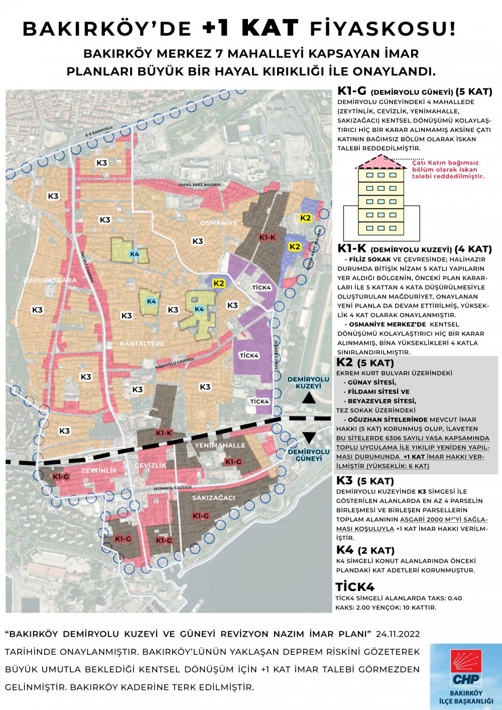 Demiryolu güneyindeki Cevizlik, Zeytinlik, Yenimahalle ve Sakızağacı mahallelerinde ise dönüşmü kolaylaştırıcı hiçbir kararın alınmadığını vurgulayan Kılıç, İBB Şehir Planlama ve Bakırköy Belediyesi’nin teklifinde ise söz konusu mahallelerdeki çatı katlarının bağımsız bölüm olarak iskan talepleri olduğunu ancak imar komisyonu tarafından bunun reddedildiğini belirtti. Demiryolu kuzeyindeki Osmaniye Merkez'de bitişik nizam yapılarda mevcut yapı stoğunun çok eski olmasından ötürü tevhiden kat artışı uygulamasının bu bölge içinde geçerli olması gerektiği vurgulandı. Filiz Sokak ve çevresinde hali hazır durumda bitişik nizam 3 katlı yapıların yer aldığı bölgenin önceki plan kararları ile 5 karttan 4 kata düşürülmesi ile oluşturulan mağduriyetin onaylanan yeni planlarda da devam ettiğini söyleyen Kılıç, bu bölgedeki yüksekliğin 4 kat olarak onaylandığını belirtti.