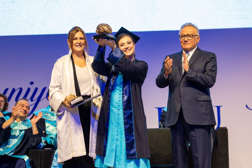 Konuşmaların ardından bu yıl derece yapan öğrenciler açıklandı. Bu yılın okul birincisi, Hacer Dilhun Yıldız oldu. Her yıl BAU okul birincilerine verilen "Altın beyin" ödülünü Enver Yücel'in elinden alan Yıldız, üniversite birincilerinin isminin bulunduğu mezuniyet kütüğüne kendi adının yazılı olduğu plakayı çaktı.