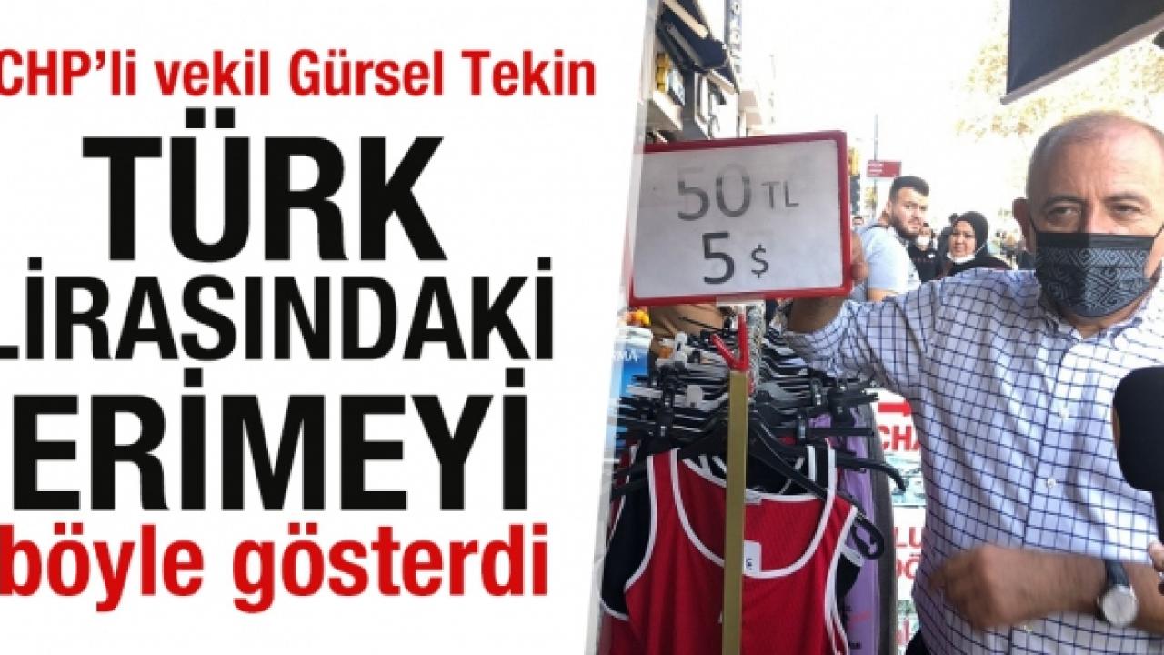 Bir esnafla sohbet eden Tekin, esnafın koyduğu fiyat tabelasını eliyle tuttu. Esnafın sattığı ürünün dolar olarak 3 birim (3 dolar), lira olaraksa 30 birim (30 lira) olduğu görüldü.