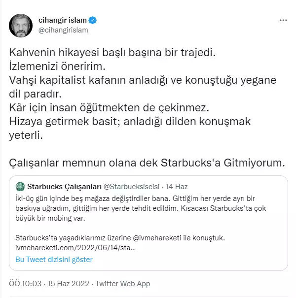 Cihangir İslam paylaşımında "Kahvenin hikayesi başlı başına bir trajedi. İzlemenizi öneririm. Vahşi kapitalist kafanın anladığı ve konuştuğu yegane dil paradır. Kâr için insan öğütmekten de çekinmez. Hizaya getirmek basit; anladığı dilden konuşmak yeterli. Çalışanlar memnun olana dek Starbucks'a gitmiyorum." ifadelerini kullandı.
