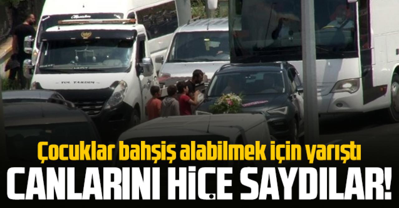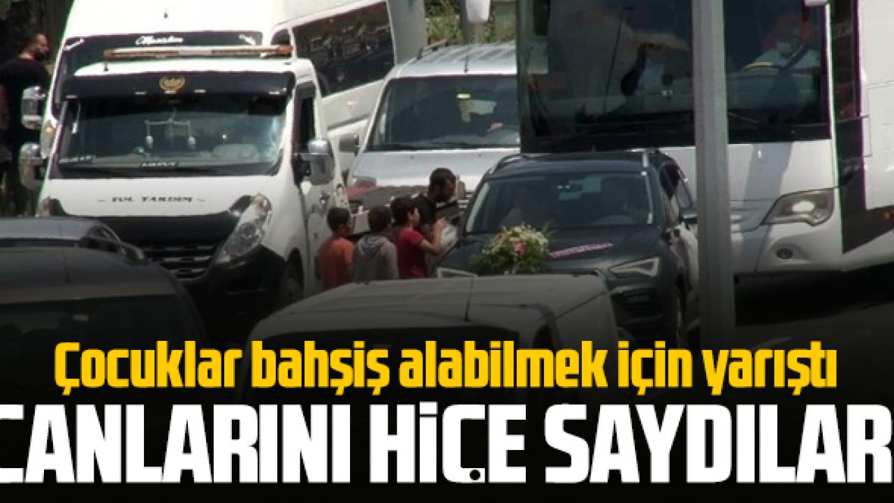E-5 karayolunda çocukların, gelin arabalarının önüne atarak para almak için uğraştığı anlar yürekleri ağızlara getirdi.