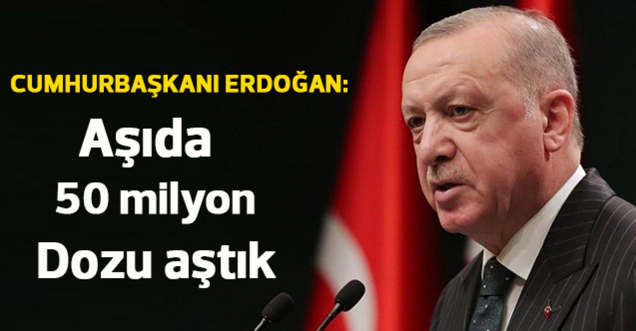 Cumhurbaşkanı Recep Tayyip Erdoğan: Koronavirüs salgınıyla mücadelede en etkili silahımız olan aşıda, hamdolsun 50 milyon dozu aştık.