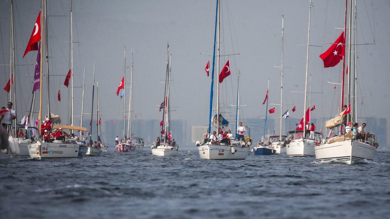 Cumhurbaşkanlığı 4. Uluslararası Yat Yarışları kapsamında yarışan 100 yelkenli dün sabah saatlerinde Cumhuriyet'in 100. yıldönümü nedeniyle İstanbul Boğazı'nda düzenlenen korteje katıldı. Türk bayraklarıyla donatılmış tekneler, Boğaz'da renkli görüntüler oluşturdu. Yarışmacılar, yarışa daha sonra Moda-Adalar parkurunda devam etti.