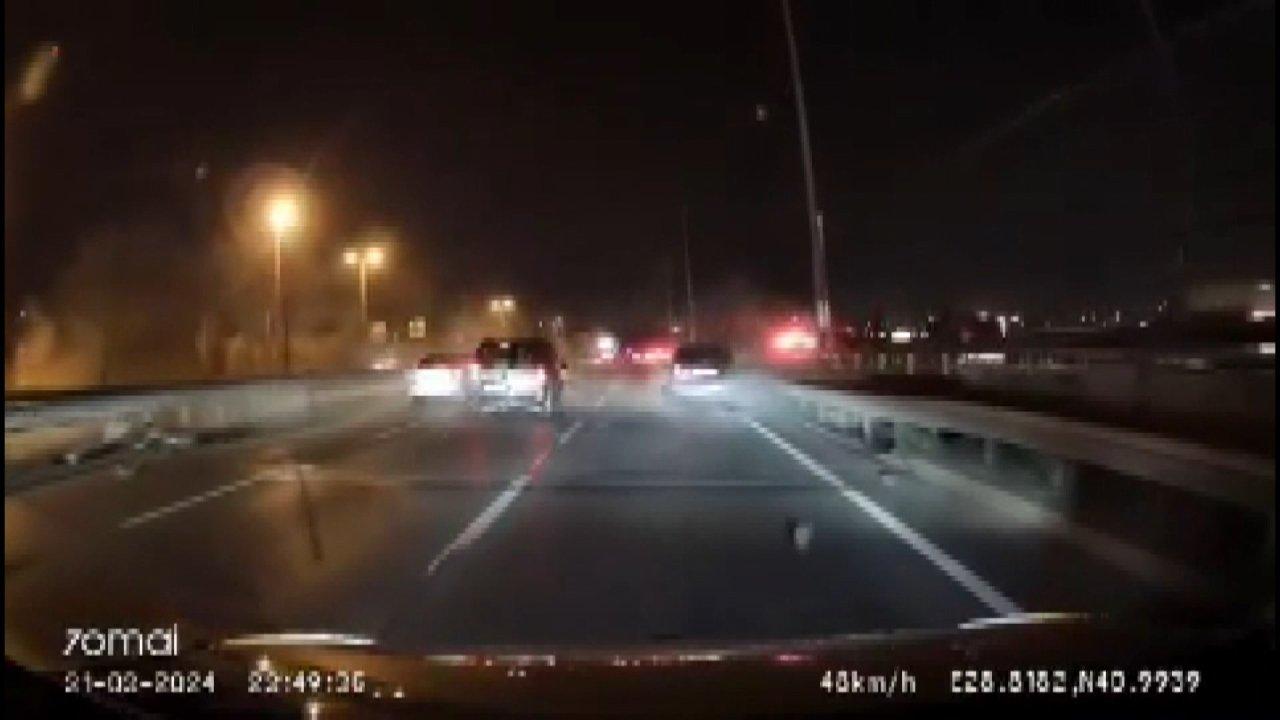 Çarpmanın etkisiyle savrulan otomobil, yolun sağındaki bariyerlere çarparak durabildi. Kaza anı, başka bir otomobilin araç kamerasına saniye saniye yansıdı.