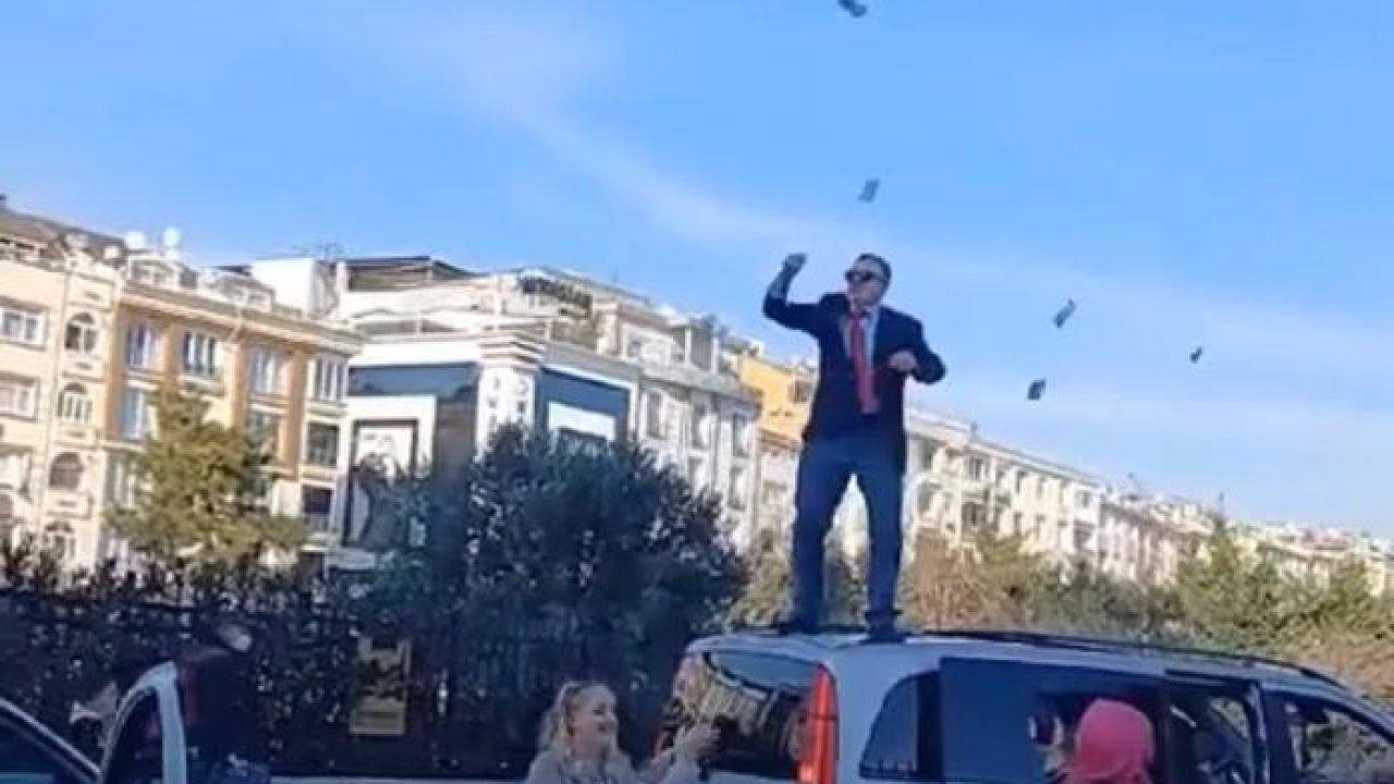 Zeytinburnu'nda, otomobilleriyle düğün konvoyu yapan grup, caddeyi trafiğe kapattı. Yüksek sesle müzik açarak oynayan gruptan biri, minibüsün üzerine çıkarak havaya para saçtı. O anlar, cep telefonu kamerasına yansıdı.