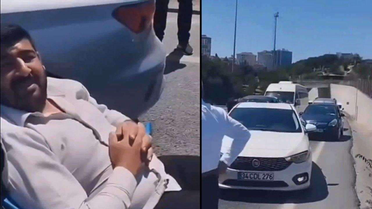 İstanbul'da düğün konvoyunda bir şoför yola sandalyesini yola koyarak oturdu. Korna seslerine aldırmayan şoförün rahatlığı dikkat çekti.