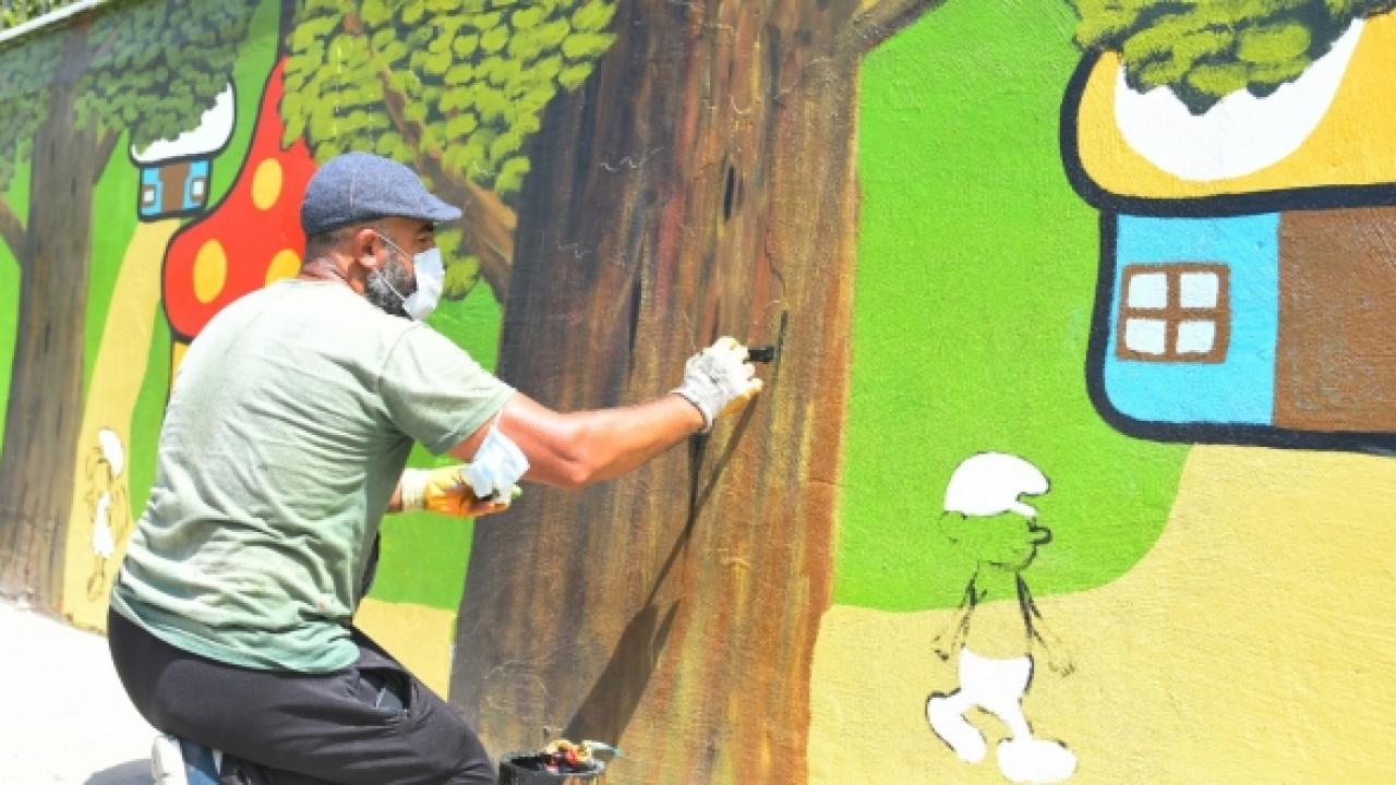 Esenyurt Belediyesi’nin Hürriyet Mahallesi Dalgıç Sokak’ta yapımına başladığı parkın duvarları, çocuklar için çizgi film karakterleriyle renklendiriliyor.