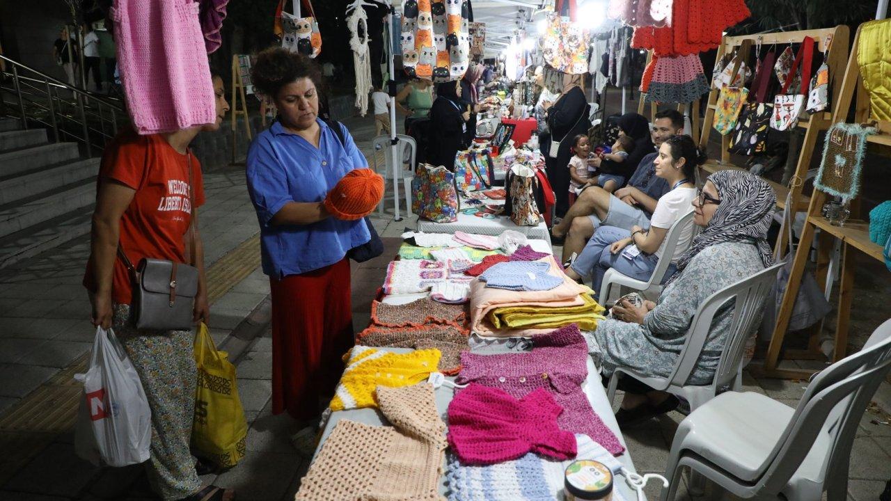 Öte yandan vatandaşların yoğun ilgisiyle karşılanan gece pazarında, üretici kadınlar boş durmadı. Kadınlar bir yandan üretirken bir yandan da ürettikleri el emeği ürünlerini satışa sundu.