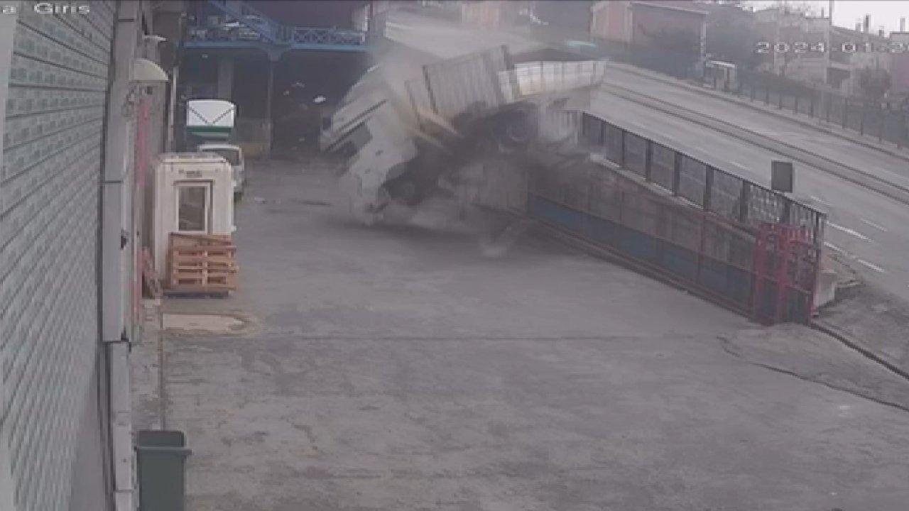 Başakşehir'de virajı aldıktan sonra şoförünün kontrolünü kaybettiği TIR bariyerleri aştıktan sonra 5 metre yükseklikten bir iş yerinin önüne düştü. İş yerinin kapalı olması nedeniyle faciadan dönülen kaza anı güvenlik kamerasına yansıdı.