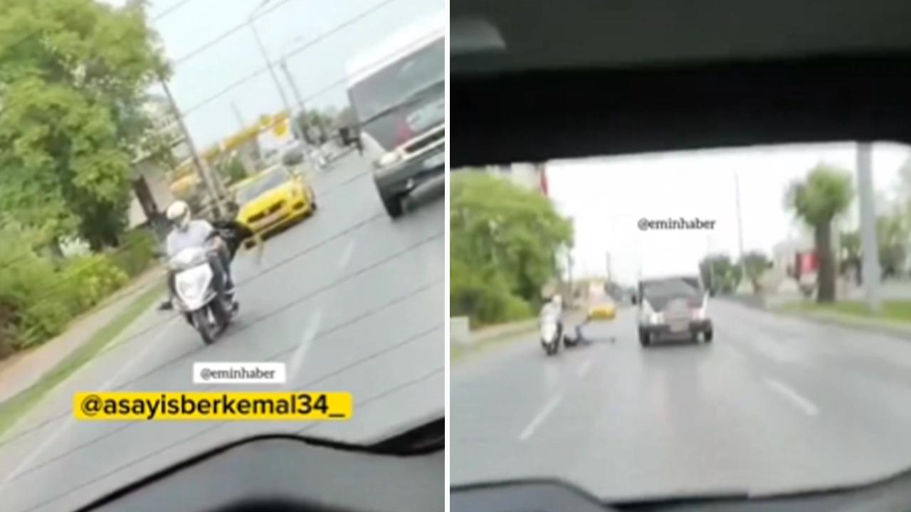 Cep telefonuyla motosikletliyi görüntüleyen şahıs, o anları çektiği esnada sürücünün arkasında bulunan adamın yere düştüğü görüldü.
