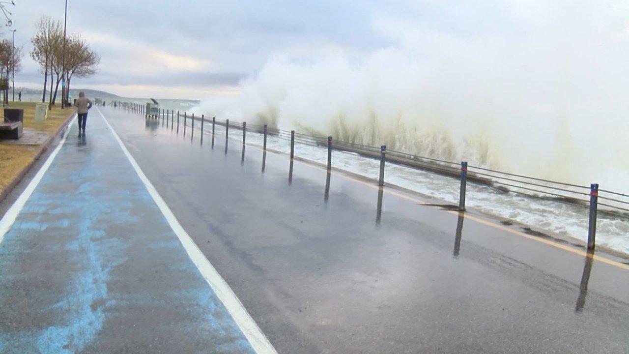 Sabah saatlerinde, Kadıköy Caddebostan Sahili'nde fırtınanın da etkisiyle denizde dev dalgalar oluştu.