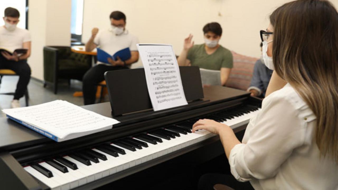 Koronavirüs salgını nedeniyle yüz yüze derslere ara verseler de bu süreci online derslerle telafi etmeye çalışan öğrencilere, Şehit Selim Kiraz Bilgi Evi Müzik Öğretmeni Yeliz Ergün tarafından eğitim veriliyor. Kayaşehir Kültür ve Yaşam Parkı’nda düzenlenen kursta öğrenciler yaklaşan sınav ve mülakatlar öncesi solfej, armoni, melodi tekrarı, ritim gibi alanlarda eğitim alıyor.