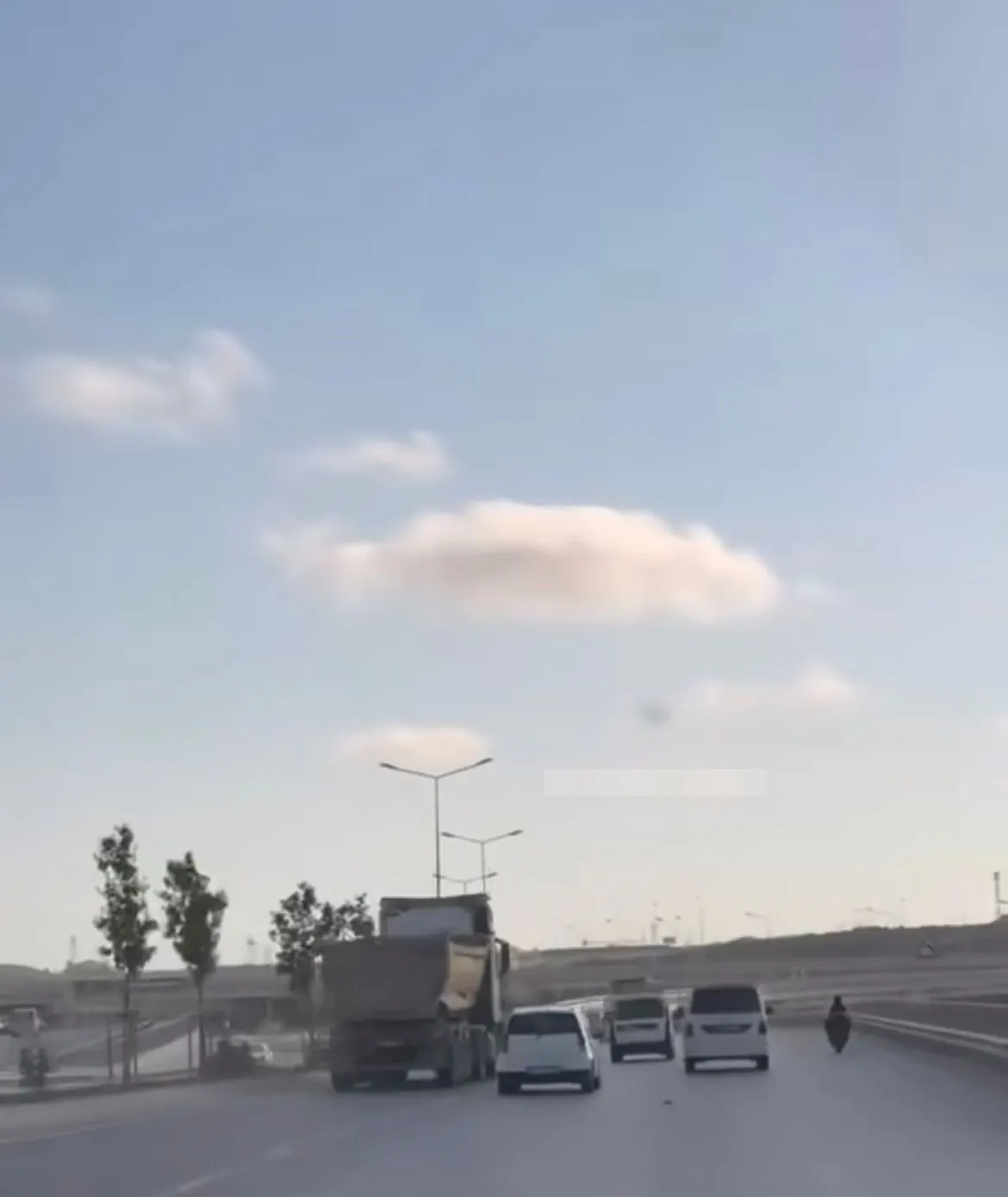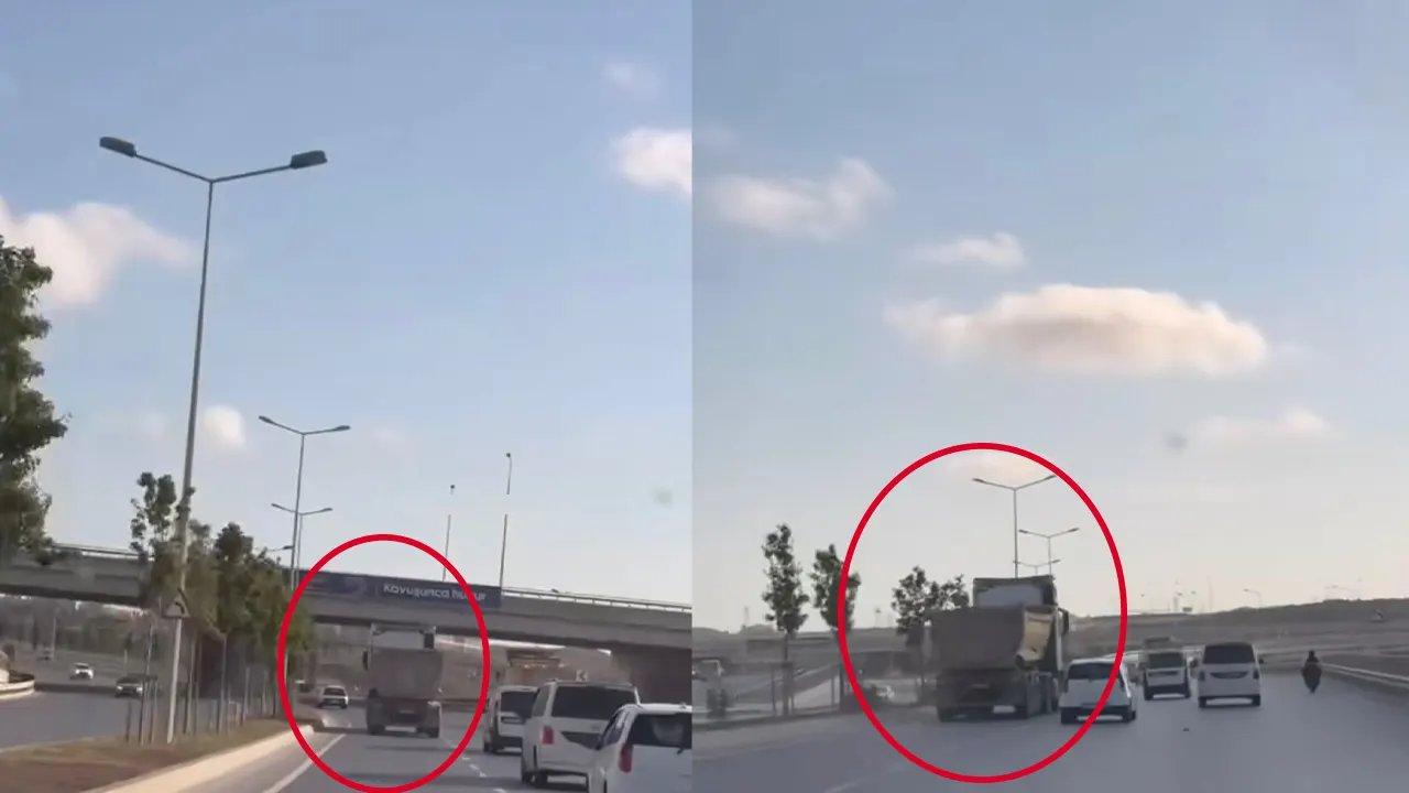 İstanbul Başakşehir Çam ve Sakura Şehir Hastanesi yolu üzerinde ilerleyen bir hafriyat kamyonu, dorsesinde yük taşımasına aldırış etmeden keskin makaslar atarak ilerlemesi diğer sürücüleri tedirgin etti.