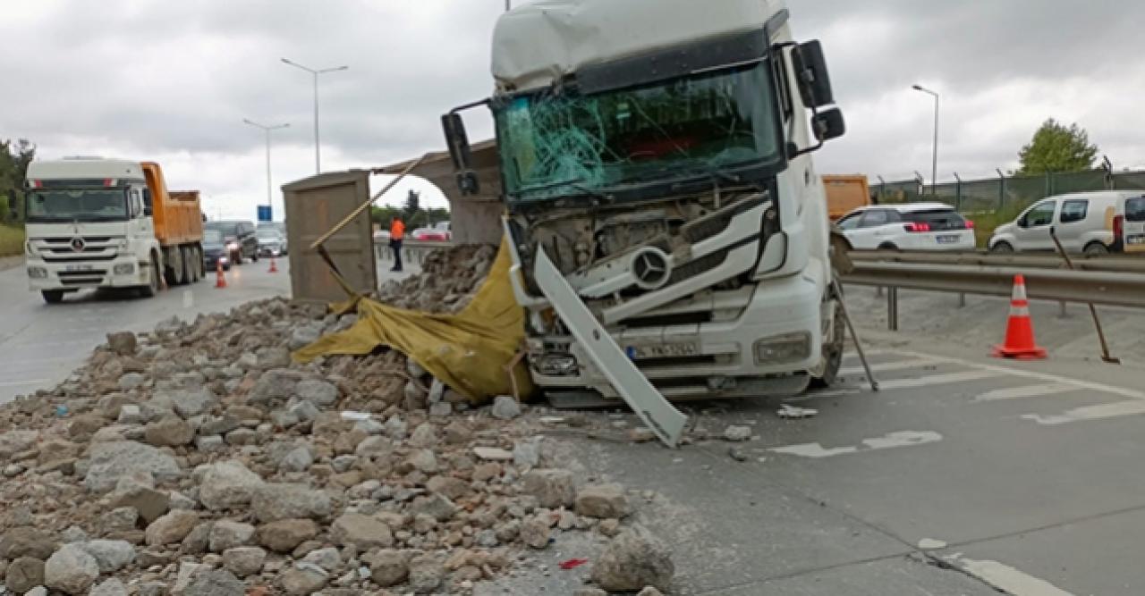 Bariyerlere de çarpan hafriyat kamyonunun damperi devrildi. Kazada iki sürücü yaralanırken yola dökülen hafriyat nedeniyle ulaşım aksıyor.