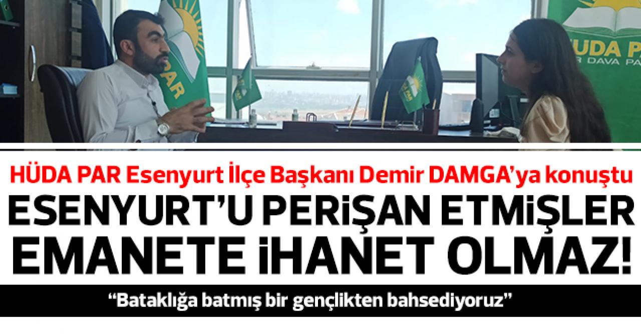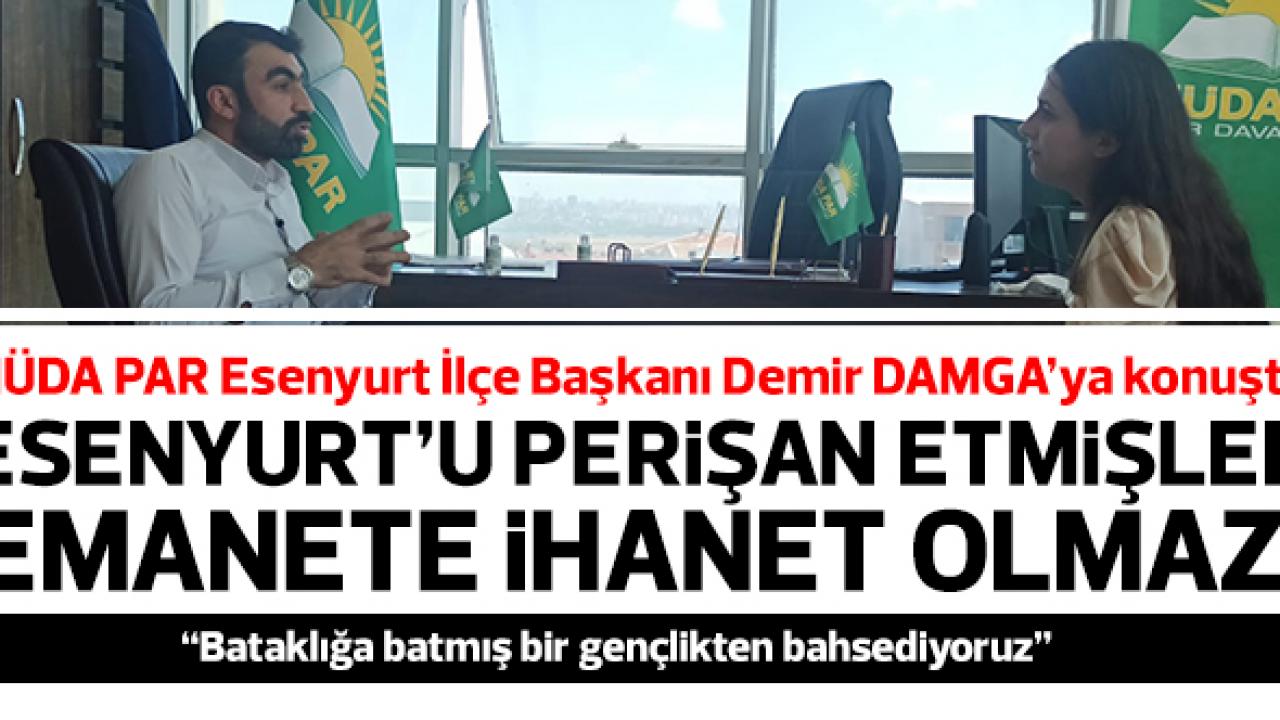 Esenyurt Hür Dava Partisi (HÜDA PAR) İlçe Başkanı Erkan Demir, Damga'ya konuştu. Demir, "Hüda Par, partiler içinde sadece parti mensuplarının ve yandaşların merkeze alındığı, insana değerin tamamen yok olduğu, kişisel menfaatlerin ön planda tutulduğu, hizmetin politik amaçlı yapıldığı, topluma karşı insana değer verme konusunda boşluğun olduğunu görmüş, özellikle siyasetin ve siyasi kimliğin kirlendiği, hizmetin konuşulmadığı, ideolojilerin konuşulduğu bu dönemde toplumu ve insanı merkeze alarak faydalı olmaya gayret etmektedir. Dünyaya bakış açımızı böyle değerlendiren bir kitleyiz" dedi.