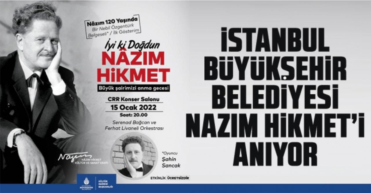 İBB Kültür Daire Başkanlığı’nın Nâzım Hikmet Sanat Vakfı işbirliği ile düzenlediği 15 Ocak 2022 Cumartesi akşamı Cemal Reşit Rey (CRR)Konser Salonu’nda gerçekleştirilecek “İyi ki Doğdun Nâzım Hikmet” etkinliğinde; yapımcılığını Nâzım Hikmet Sanat Vakfı ve Bir Yudum İnsan Film’in, yönetmenliğini Nebil Özgentürk’ün üstlendiği “Nâzım 120 Yaşında” belgeselinin ilk gösterimi yapılacak.