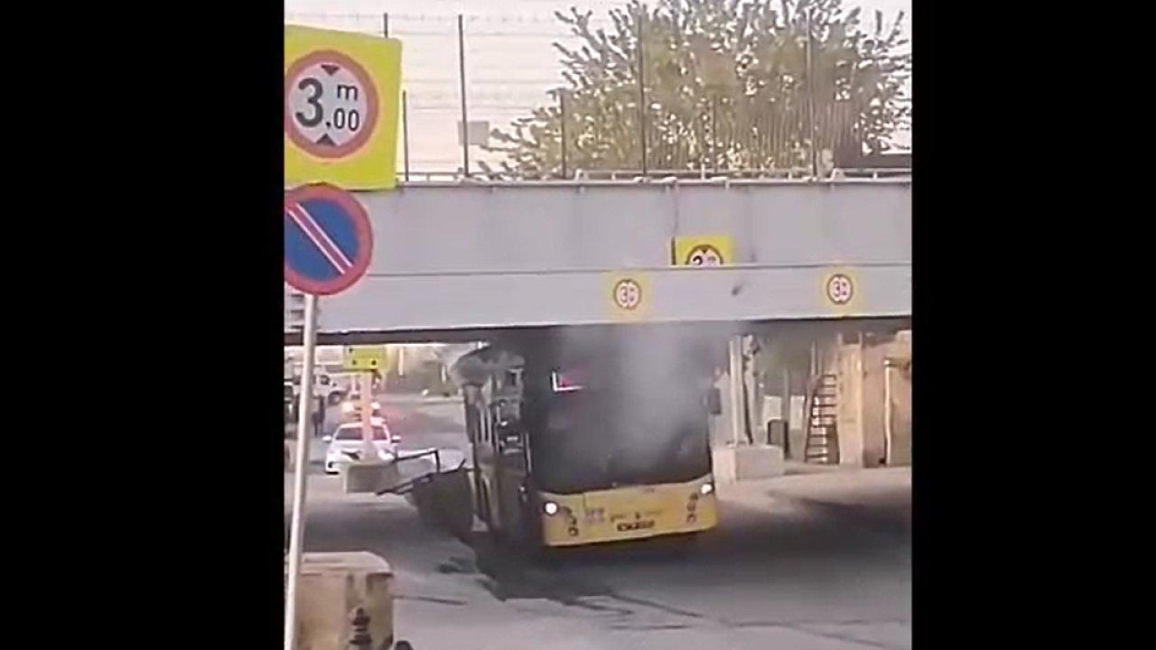 Köprünün yüksekliğini hesaplayamayan İETT otobüsü, alt geçitte sıkıştı. Tam köprünün altından geçecekken geçide çarpan otobüsten bir anda dumanlar yükselmeye başladı.