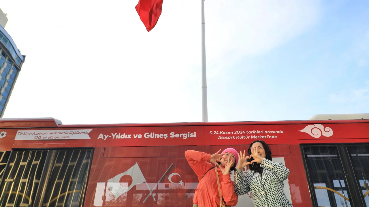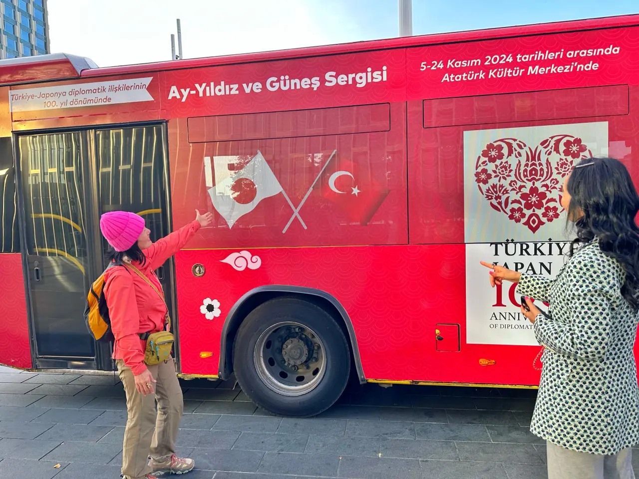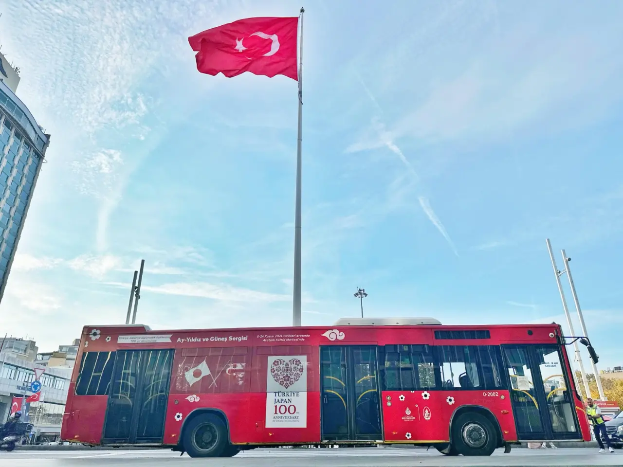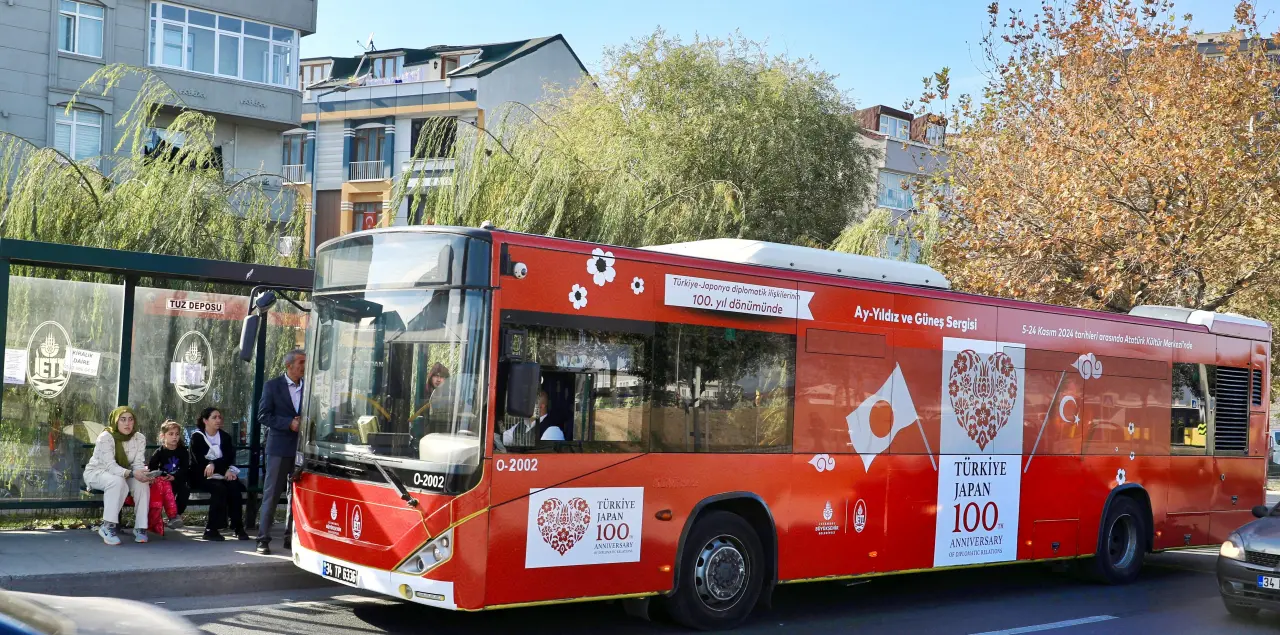 Otobüste; Türkiye ve Japonya bayrakları, diplomatik ilişkilerin100.yılına özel hazırlanan logo ve 100.yıl için İstanbul Atatürk Kültür Merkezi’nde 5-24 Kasım 2024 tarihlerinde ücretsiz olarak gezilebilecek serginin de bilgileri yer alıyor.