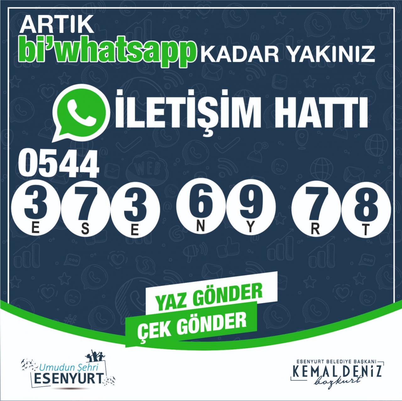 1 milyona yaklaşan nüfusuyla Türkiye’nin en kalabalık ilçesi olan Esenyurt’ta sorunların daha hızlı iletilip çözülmesi Whatsapp İletişim Hattı kuruldu. Türkiye’nin en kalabalık ilçesi olan Esenyurt’ta, vatandaşların belediyeye daha hızlı ulaşması için Halkla İlişkiler Müdürlüğü bünyesinde Whatsapp İletişim Hattı kuruldu.