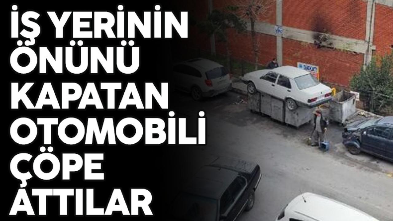 BAŞAKŞEHİR'de bir sanayi sitesindeki iş yerlerinin önünü kapatan otomobilin sahibine ulaşamayan esnaf, forklift ile kaldırdıkları aracı çöp konteynerlerinin üzerine bıraktı.
