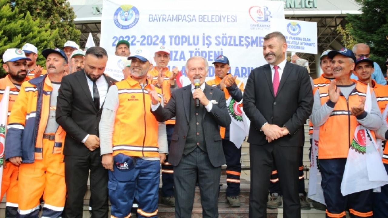Bayrampaşa Belediyesi ile Hizmet-İş Sendikası arasında 2 yıl süreli Toplu İş Sözleşmesi imzalandı. Belediye hizmet binası önünde düzenlenen törende, sözleşmeyi belediyeyi temsilen Başkan Atila Aydıner, sendikayı temsilen Hizmet-İş Genel Başkan Yardımcısı Mehmet Keskin imzaladı. Toplam bin 50 işçiyi kapsayan yeni sözleşmeye göre, işçilerin ücretlerine brüt yüzde 80 zam yapıldı, sosyal hakları iyileştirildi ve ücretlerin 6 ayda bir enflasyon oranında artırılması kararlaştırıldı. İmza törenine Başkan Aydıner ve Mehmet Keskin’in yanı sıra AK Parti Bayrampaşa İlçe Başkanı Ersin Saçlı, belediye başkan yardımcıları, meclis üyeleri, birim müdürleri sendika temsilcileri ve işçiler katıldı.