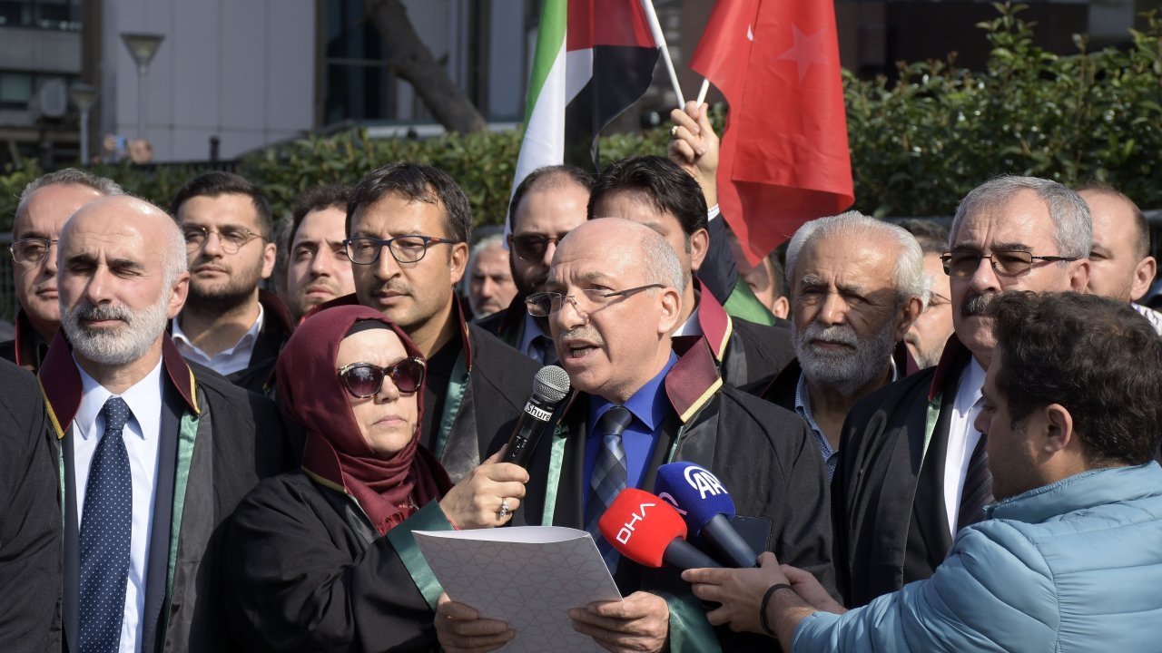 İstanbul 2 No'lu Barosu'na üye bir grup avukat, Gazze'de sivil Filistin halkına karşı yapılan saldırıyı protesto etmek için cübbeleriyle İsrail İstanbul Başkonsolosluğu önünde basın açıklaması yaptı.