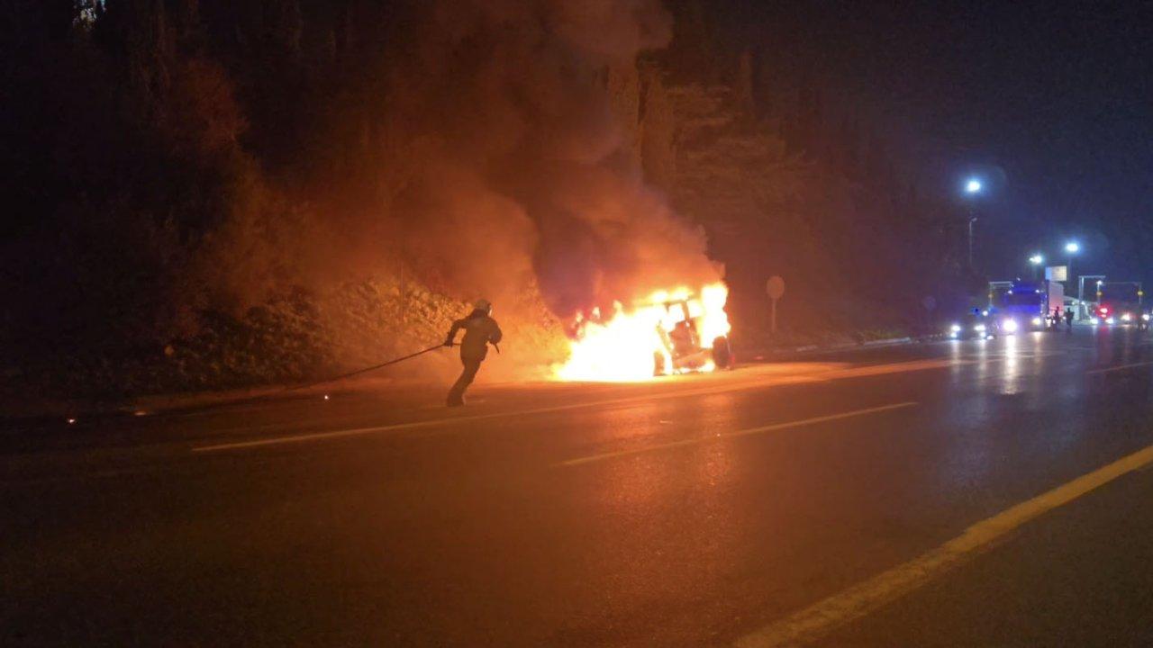 Alevlerin kısa sürede büyüdüğü yangında aracın şoförü cipi emniyet şeridine çekip kendisini de dışarı atmaya başardı.